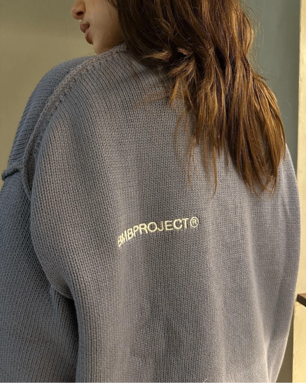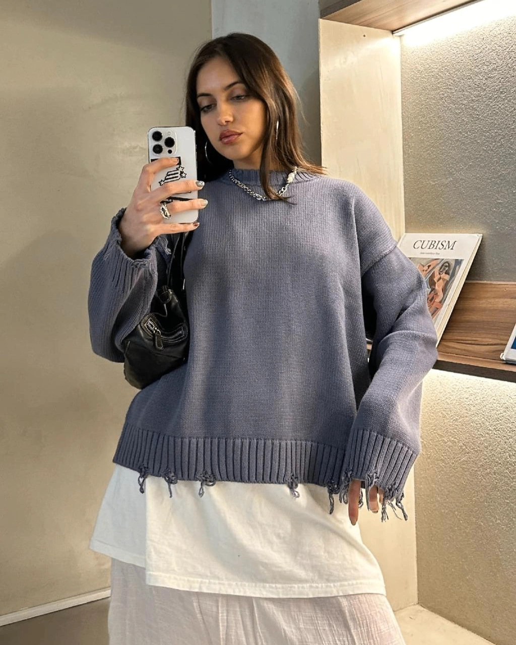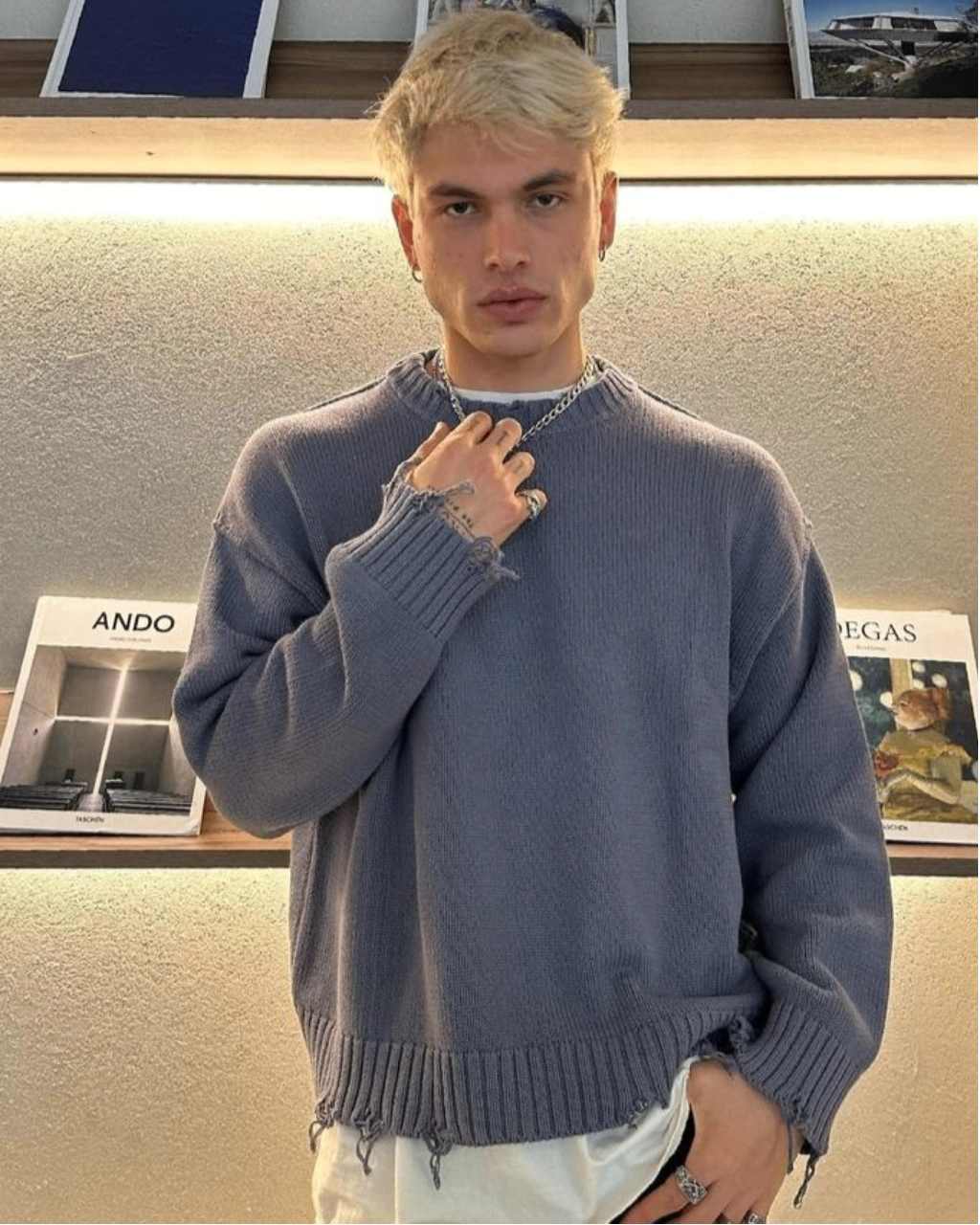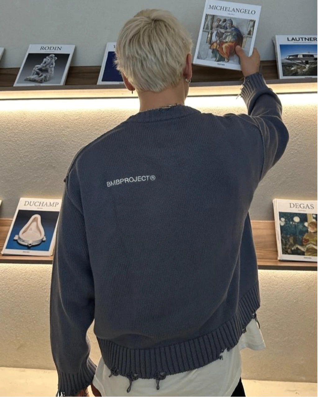 • Sweater boxy fit crudo con roturas. Bordado en la espalda
