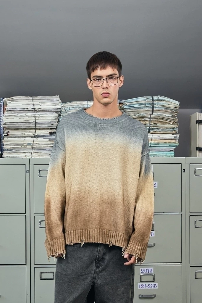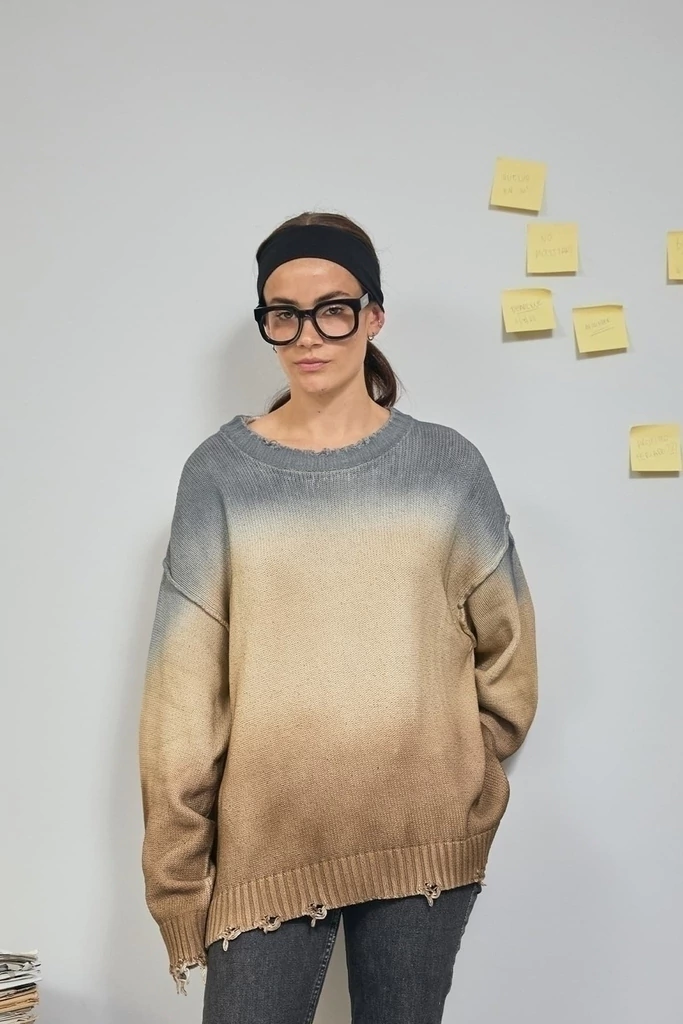 • Sweater boxy fit degradé marrón a gris con roturas. Bordado en la espalda: bmbproject.